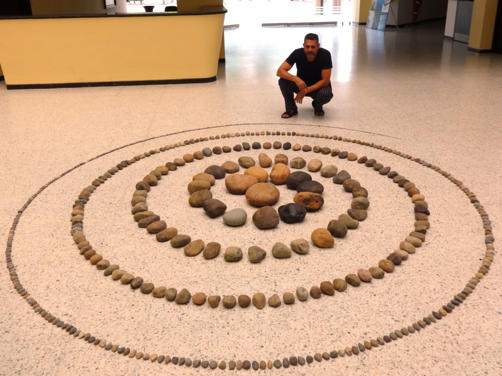 La instalación titulada «La Espiral del Silencio» es una obra llena de simbolismos. Se forma a patir de la espiral que los indígenas arhuacos tejen en el fondo de sus mochilas y que al igual que los Maguey (asentamiento aborígen que le dio el nombre a Magangué) profesan un profundo respeto por el río y la madre tierra, creyendo en la posibilidad de habitar un mundo en paz y en armonía con el medio ambiente. La otra obra con la que participo en Hallazgos se titula Sur de Bolívar. Es una obra elaborada con troncos y maderos que bajaron por el río Magdalena, contando historias de un pueblo abandonado, desplazado de sus tierras y que ven en el río, no un medio de navegación y sustento, sino una vía de escape.