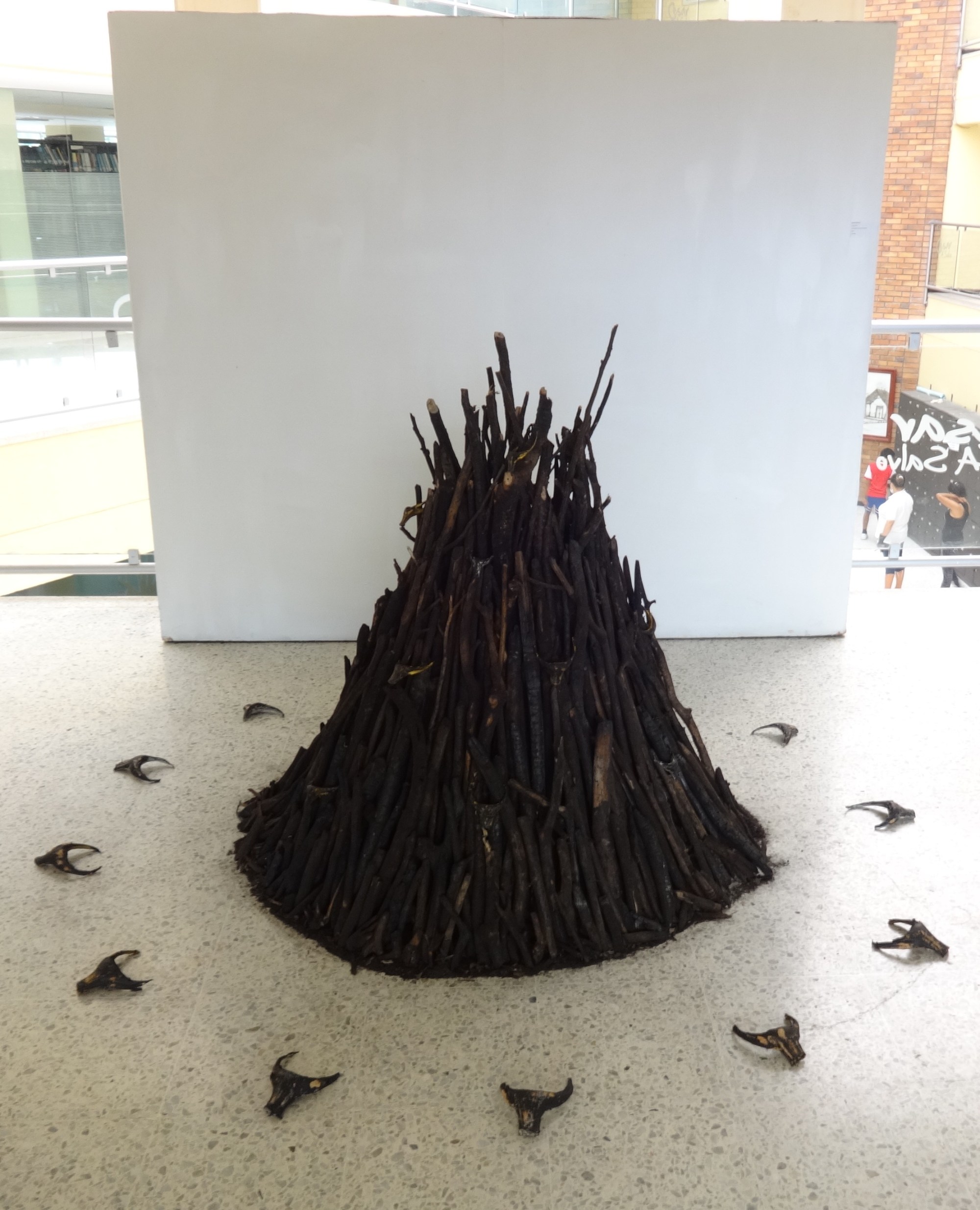 Amauri Mercado (Sincelejo, 1984). Desarrolla una instalación que titula “Carbonífero” que parte de la observación del artista en el entorno natural. Amauri vive en las afueras de Sincelejo y su contacto con el campo es permanente, su obra recoge todo ese material que queda después de las quemas que se hacen en los terrenos, para “prepararlos” para la siembra, práctica ancestral en nuestros campos, pero que deteriora y fatiga el suelo generando también una afección al medioambiente.