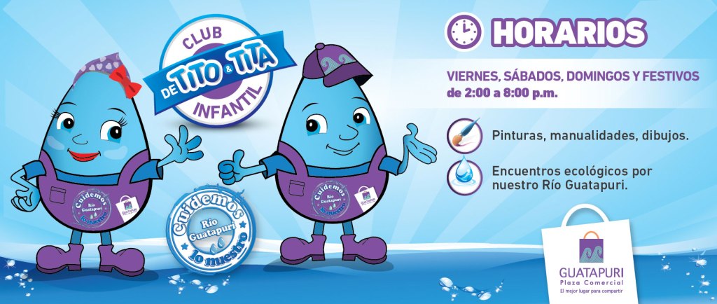 Tito y Tita (diminutivos de gotito y gotita) son dos personajes que encarnan la protección del río Guatapurí, transmitiendo el mensaje a través del arte, la ciencia y la inclusión social; talleres infantiles de dibujo y manualidades, encuentros ecológicos, visitas guiadas a las exposiciones del centro comercial y acompañamiento a los procesos de educación ambiental en las escuelas de la ciudad, son algunas de sus principales actividades.