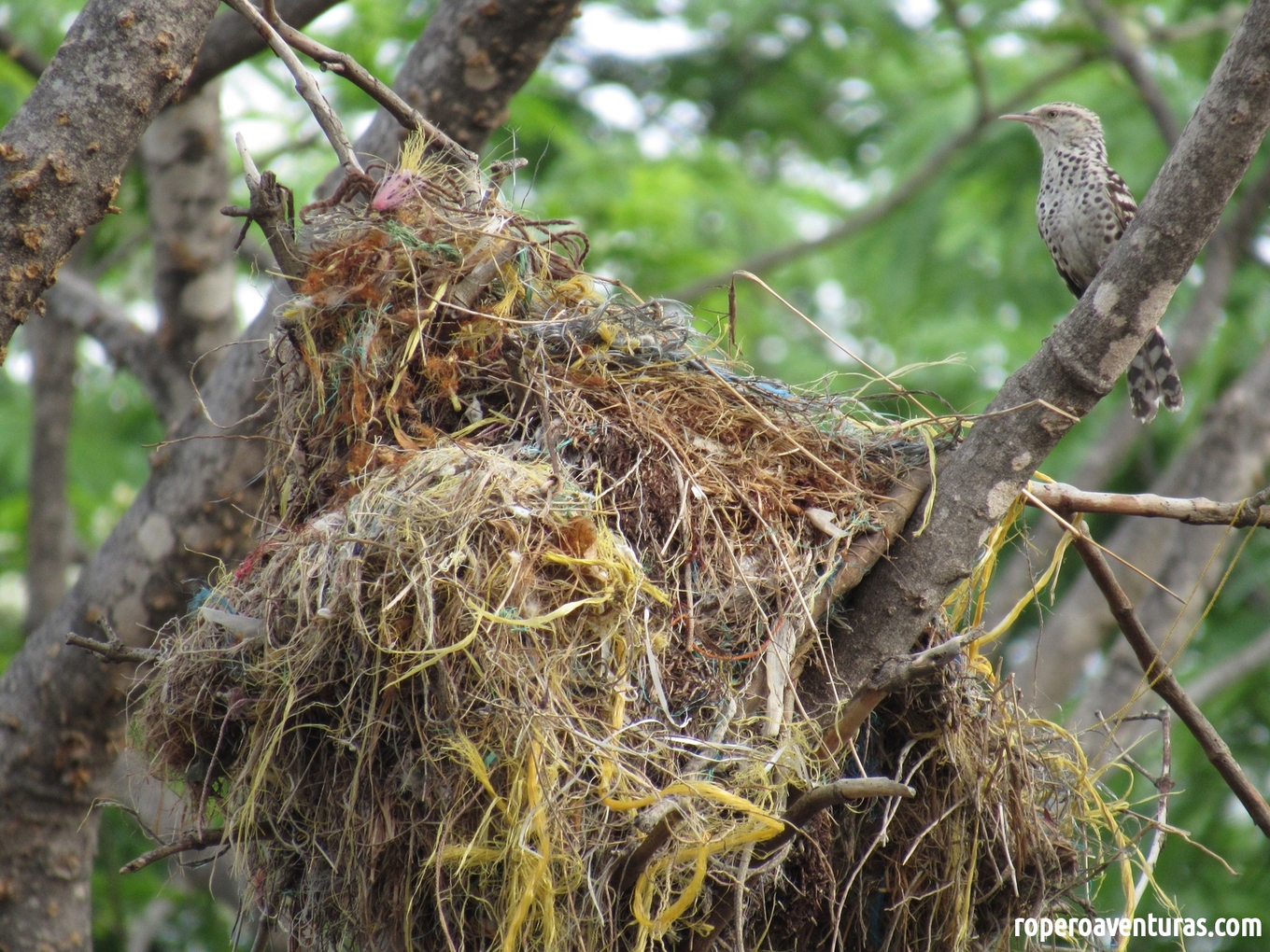 Los cucaracheros aprovechan toda clase de fibras disponibles en el hábitat para la construcción de sus nidos, incluyendo desechos generados por el hombre, aquí en el sector del balneario Hurtado, Valledupar. Foto: Jose Luis Ropero.