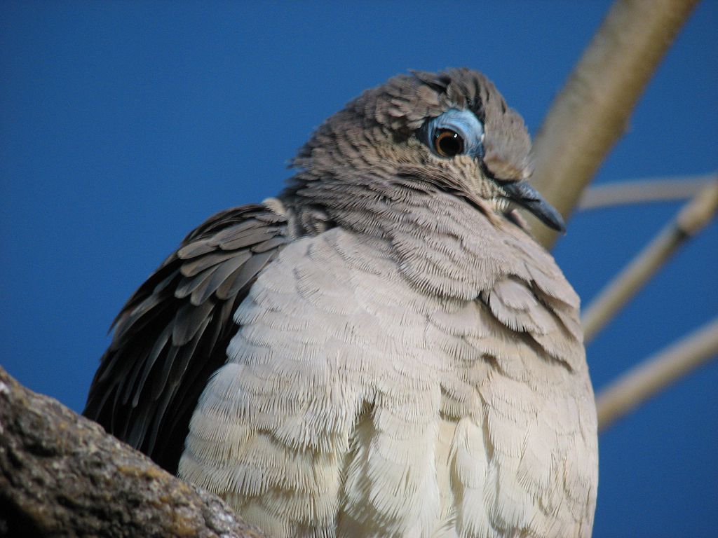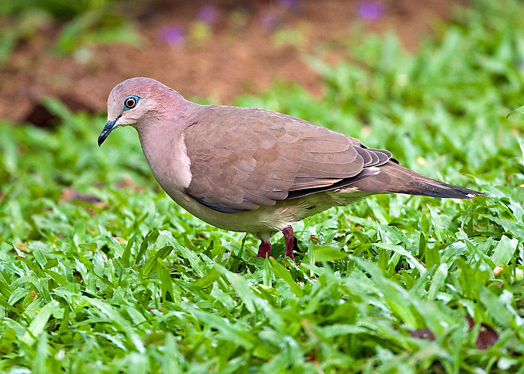 Características: el ave mide alrededor de 28 cm desde el pico a la punta de la cola y pesa en promedio 155 gr; los ejemplares adultos tienen un tinte gris desde la corona hasta la nuca, la frente es gris pálido y la garganta blancuzca, sus alas son marrón grisáceo y las coberteras pueden ser rojizas. Es llamativa su piel azulada alrededor de los ojos.