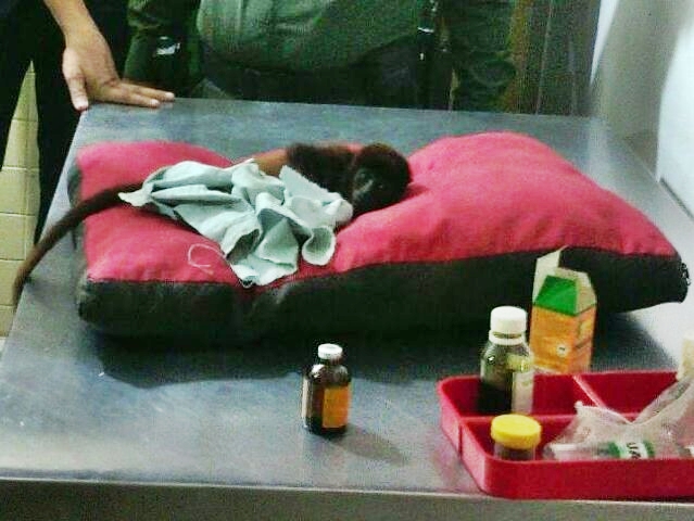 El cabo Diego Rey, suboficial de gestión ambiental, fue comisionado para trasladar el mono hacia un centro veterinario; por disposición del biólogo Marino Zuleta, adscrito a Corpocesar, se llevó el animal a la clínica “Dejando Huellas” de Valledupar, donde fue atendido por el veterinario Edgardo Guerra; lamentablemente la gravedad de las lesiones obligaron a amputarle la pata izquierda y dos dedos de su mano derecha, pero se le pudo salvar la vida; ahora la criatura sigue su recuperación en el Centro de Atención de Fauna Silvestre, operado por Corpocesar en el corregimiento de Valencia de Jesús, zona rural de Valledupar. Esta labor contó con la colaboración de agentes de la Policía Ambiental.
