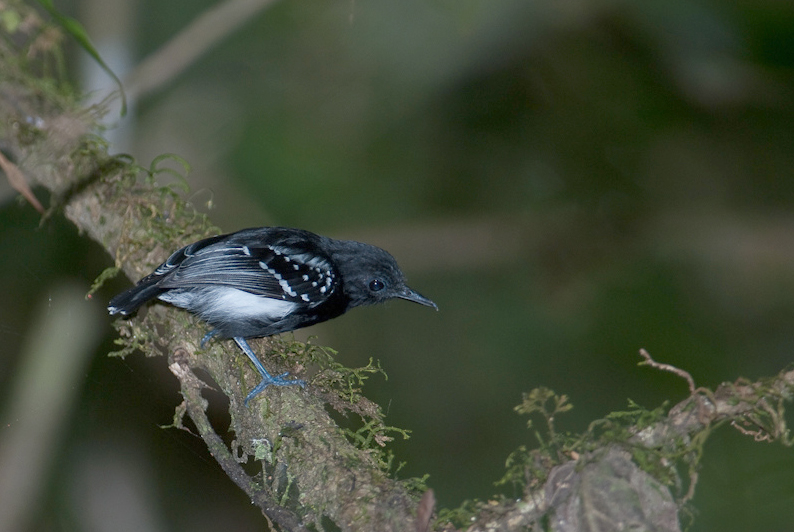 Características: es el más extendido de todos los hormigueros, un grupo de aves que se caracteriza por su pequeño tamaño y rectrices cortas; tienen la parte superior de las alas negras con listas y motas blancas, es la única especie de hormigueros con los flancos y parte inferior de las alas en color blanco; sin embargo las hembras y los inmaduros tienen las partes superiores marrones y sus partes inferiores son de color crema amarillento, con la parte superior de las alas pardo rojizas ligeramente listadas. Se observa frecuentemente en bandadas junto a otras especies, alimentándose activamente de artrópodos haciendo estocadas o cortos vuelos. Construyen nidos en forma de copa con fibras vegetales y hojas muertas que colocan en las ramas bajas de los árboles o los arbustos. Las hembras suelen poner dos huevos blancos con motas violetas, que incuban ambos miembros de la pareja durante 16 días.