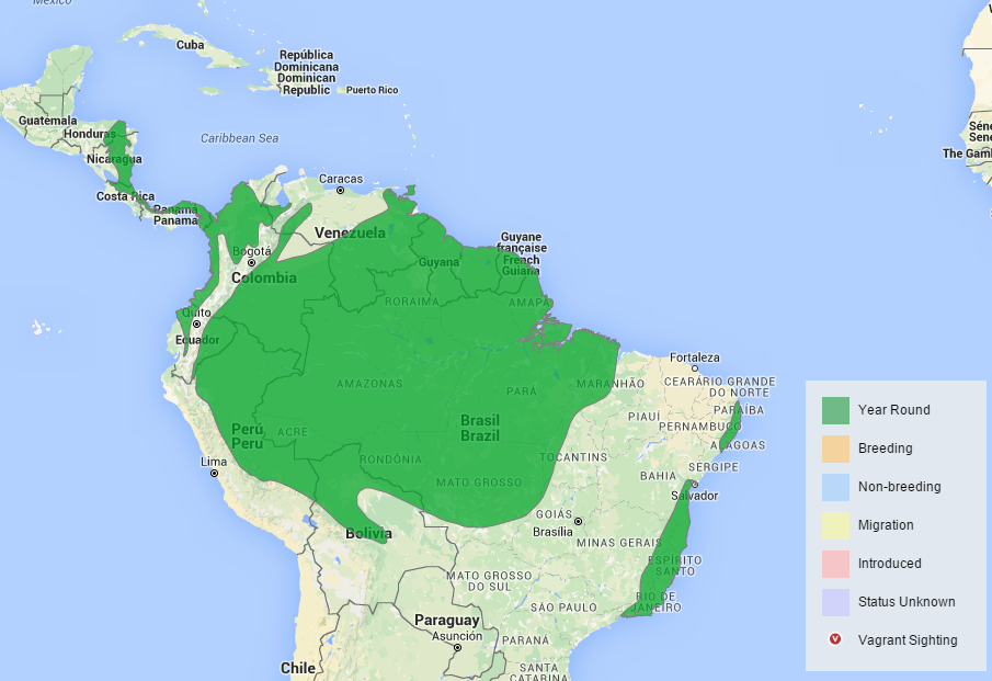 Hábitat: se encuentra en bosques y selvas tropicales de América por debajo de 900 msnm, desde Honduras hasta Brasil, incluyendo toda la cuenca amazónica, los valles interandinos y la costa pacífica de Colombia; también hay una población aislada en el litoral atlántico del suroriente de Brasil.