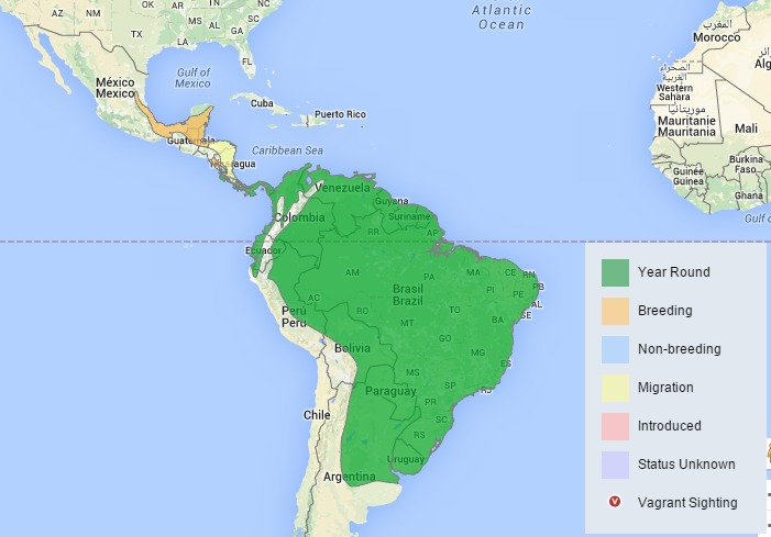 Hábitat: es una habitante ampliamente extendido de los bosques y selvas de centro y Suramérica, desde México hasta el centro de Argentina. Es residente en gran parte de las regiones donde habita, pero las poblaciones tanto del norte (desde México a Nicaragua) como del sur (Argentina y Uruguay) migran durante las épocas de cría; las de Centroamérica se dirigen a Panamá y al norte de Suramérica, mientras que las de Argentina y Uruguay migran a Colombia y Venezuela al terminar la temporada de cría.