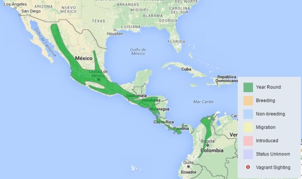 Hábitat: individuos aislados han sido observados vangando por los estados sureños de EEUU. Esta especie se distribuye desde el noroeste de México hasta el centro de Colombia y el norte de Venezuela. Su rango de altitud es muy amplio, habitando desde las tierras bajas hasta los 3000 msnm. Habita un amplio rango de matorrales y zonas arboladas, pero generalmente está ausente de las zonas más densas del bosque.