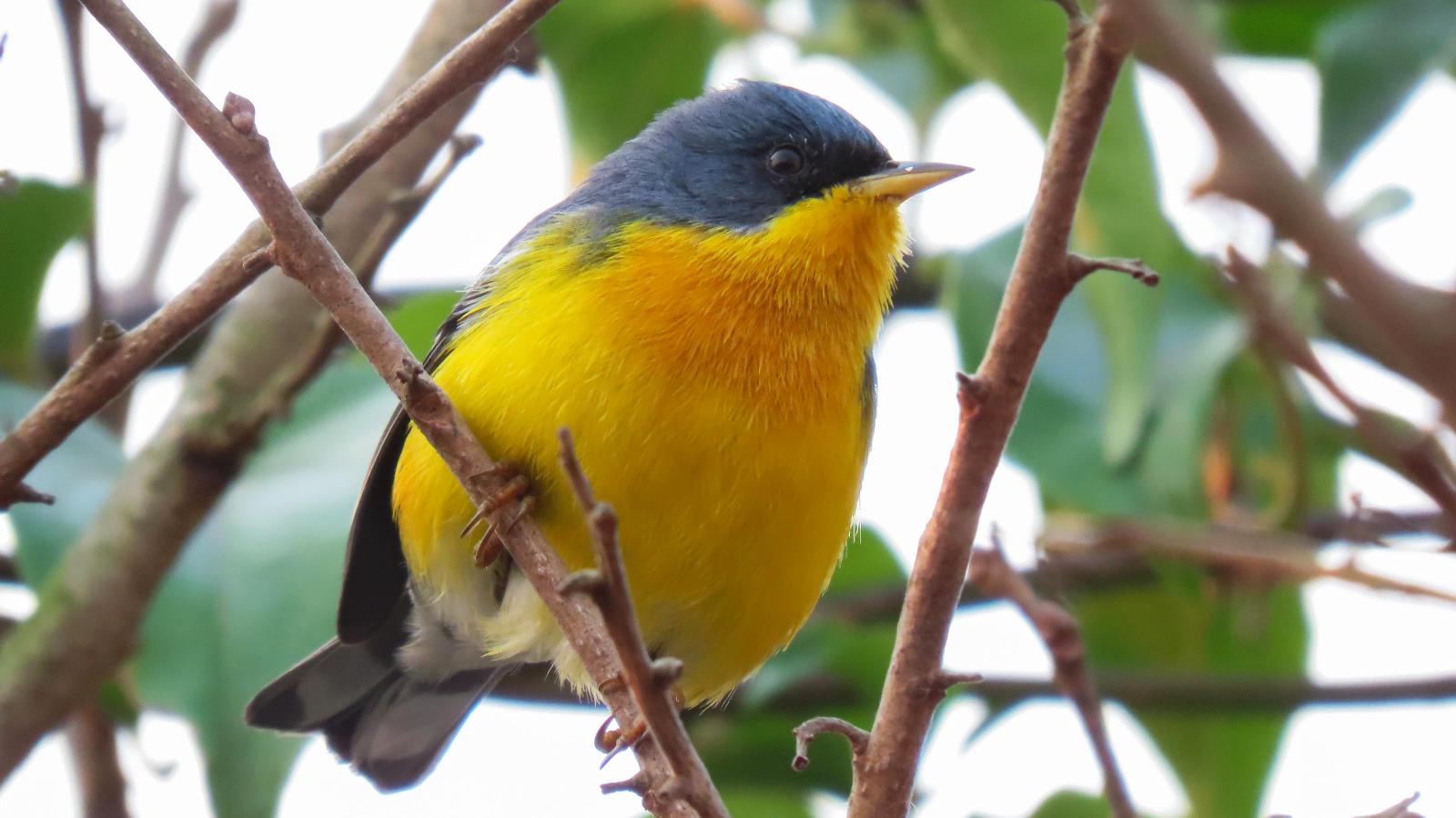 Pequeña ave de color amarillo y azul, posada entre ramas delgadas.