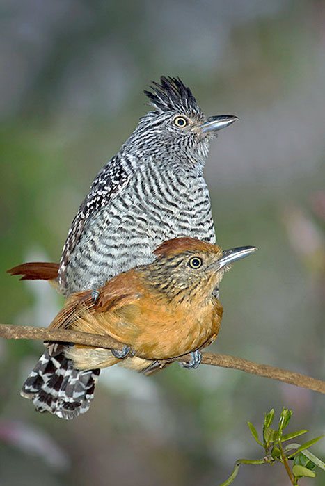 Características: es una especie monógama de largo plazo, las parejas permanecen juntas durante la mayor parte del año en un mismo territorio. El plumaje barrado del macho consiste de líneas alternadas blancas y negras a lo largo de todo el plumaje; en algunos territorios, la corona del macho es totalmente negra, en otros, los machos tienen un parche blanco semi-escondido cerca a la parte posterior de la corona. En las hembras, el plumaje es de un color canela-rojizo y el pecho es de un ocre-anteado más claro. Ambos sexos tienen un pico de tamaño medio-largo con una curva semi-roma en la punta.