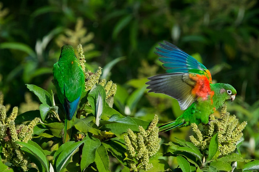 Características: Mide hasta 25 cm de longitud. Su plumaje es verde con punto frontal de color rojo, anillo orbital desnudo blanco, abrigos del oído color marrón, banda roja en el vientre, hombro anaranjado; primarias de las alas azules; debajo de la cola color rojo. Vuela en pequeñas y densas bandadas, frecuentemente en vuelo arremolinado sobre la copa de los árboles. Su dieta comprende más de 20 especies de plantas, las cuales varía según su disponibilidad a lo largo del año; se alimenta de frutos, por ejemplo de epífitas, así como también de flores y de semillas, como las de Cordiaceae. Su temporada de reproducción va de diciembre a mayo y, excepcionalmente, entre julio y octubre. Anida en cavidades de troncos secos de árboles o palmas.