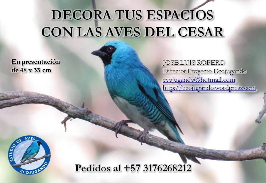 El PROYECTO ECOJUGANDO y su director Jose Luis Ropero, presenta a toda la comunidad su colección de pósters coleccionables «Aves del Cesar», con los cuales podrás decorar tus espacios con imágenes de la bella avifauna de esta región, son 12 motivos con las siguientes especies de aves: chillón pardo, chauchao, trepatroncos piquirrecto, garcita nívea, albañil, carpintero habado, piranga abejera, bichofué, guayabero rayado, azulejo golondrina, cucarachero cantor, güicha hormiguera y mirla parda.