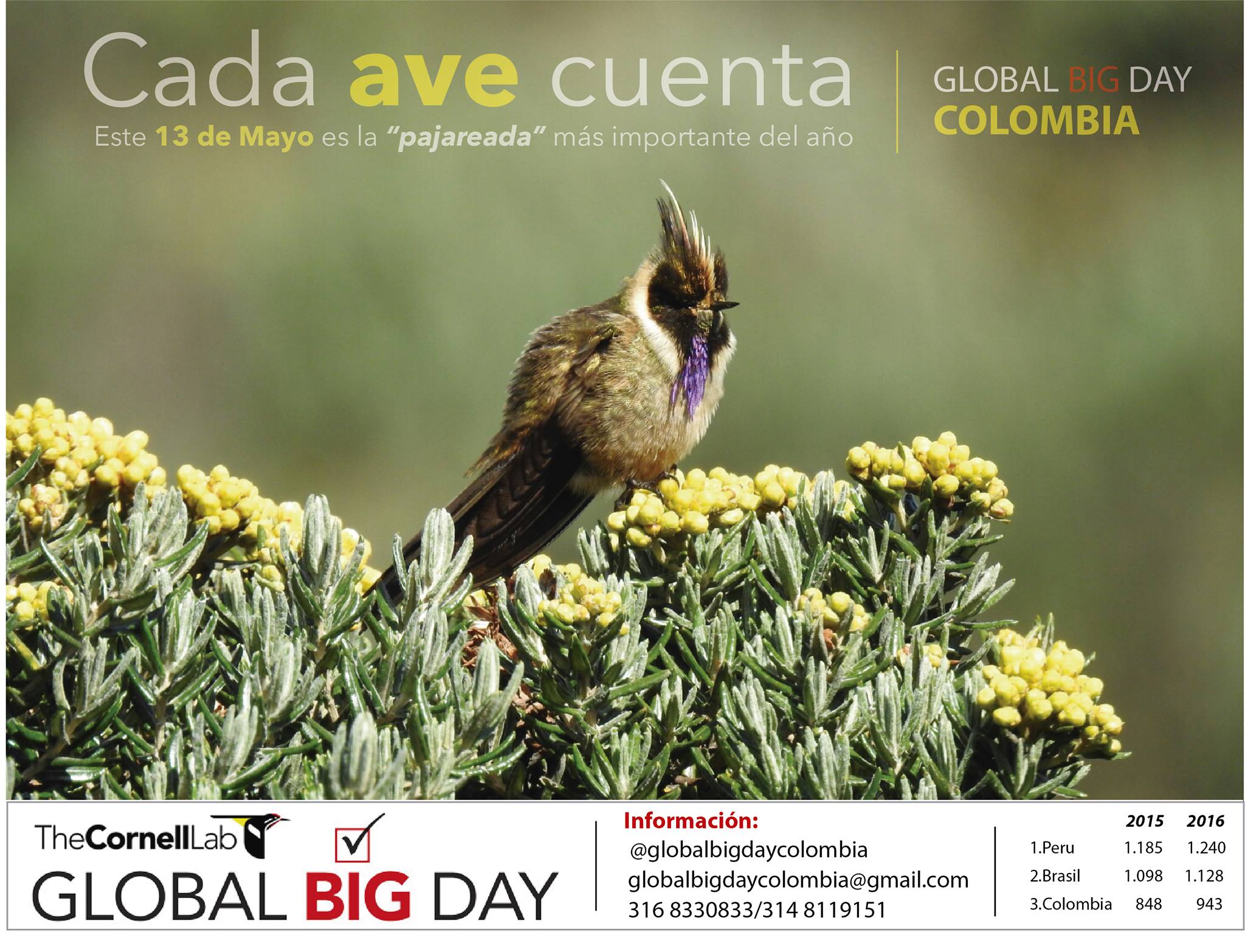 Este 13 de mayo se realizó la tercera edición del Global Big Day, una de las principales festividades de los observadores de aves, académicos o aficionados, a nivel mundial. Esta iniciativa de la plataforma ebird.org, de la Universidad de Cornell (EE. UU.), reunió más de 20000 participantes en 150 países, unidos por el honor de promover el conocimiento ornitológico y aportar a la conservación de las aves y sus hábitats. Colombia, con 1486 especies avistadas, ocupó el primer lugar superando tres impresionantes registros en Suramérica, como el de Perú (1338), Ecuador (1259) y Brasil (1079). Nuestro país también se destacó en la cantidad de listas enviadas (2410), siendo el tercer país en esta categoría, detrás de Estados Unidos y Canadá.