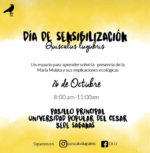 El 26 de octubre se realizó en el campus de la Universidad Popular del Cesar una jornada pedagógica para el conocimiento del ave llamada mariamulata llanera (Quiscalus lugubris), la cual fue dirigida por los jóvenes naturalistas María Carolina Barros y Andrés Figueroa, en el marco de su proyecto de grado en ciencias naturales titulado «Redes sociales como herramienta pedagógica para el conocimiento de la especie Quiscalus lugubris».