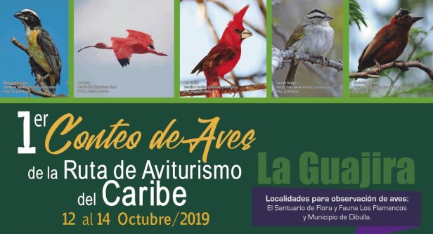 Este encuentro que se realizará del 12 al 14 de octubre de 2019, está dirigido por TOCUYO BIRDING y cuenta con el respaldo de prestigiosas instituciones como USAID COLOMBIA, OIM-ONU MIGRACIÓN, AUDUBON SOCIETY, PARQUES NACIONALES, SENA RURAL y la autoridad ambiental CORPOGUAJIRA. Tendrá como escenario el corregimiento de Camarones, el Santuario de Fauna y Flora Los Flamencos y la parte rural de Dibulla.
