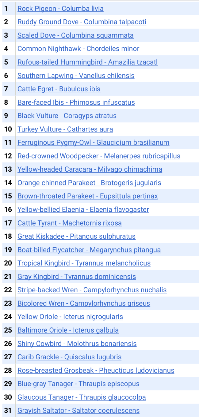 Durante el mes de abril logré avistar 31 especies de aves en 100 metros a la redonda de mi hogar; también estuve atento mirando hacia el cielo y así pude encontrar sobrevolando algunos pájaros que prefieren estar en hábitats menos poblados, como el busardo negro (Buteogallus anthracinus), la garcita bueyera (Bubulcus ibis) y la tanga (Vanellus chilensis), esta última alertando siempre de su paso, con su particular claxon.
