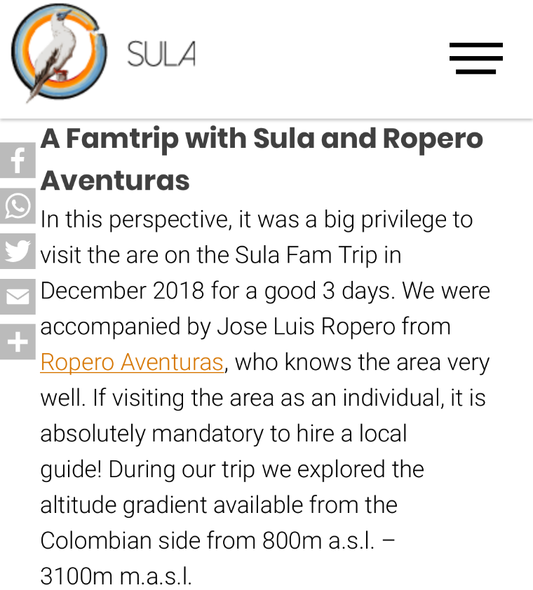De los resultados de este famtrip ha surgido un producto de aviturismo de alta calidad, que la agencia SULA hoy presenta a sus clientes en todo el mundo y el cual confiamos en que será de un gran éxito una vez sea superada la situación de fuerza mayor que atraviesa el mundo en la actualidad. En su página web sula.com.co/blog/ la agencia ha publicado recientemente una reseña de este famtrip, en la cual se hace mención especial del buen servicio prestado por su servidor Jose Luis Ropero, como guía local.