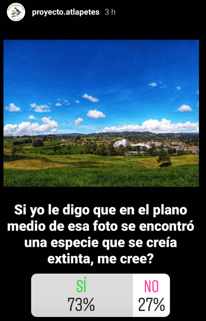 Pero en 2019 el ingeniero Rodolfo Correa lo redescubrió y junto a los ornitólogos Sergio Chaparro, Andrea Lopera y Juan Luis Parra, describieron su ecología, le tomaron las primeras fotografías y grabaron su canto por primera vez, iniciando el Proyecto Atlapetes, que con la participación del campesinado de esa región ha liderado acciones exitosas para la conservación de la especie y su hábitat natural. Una solución 100% colombiana.